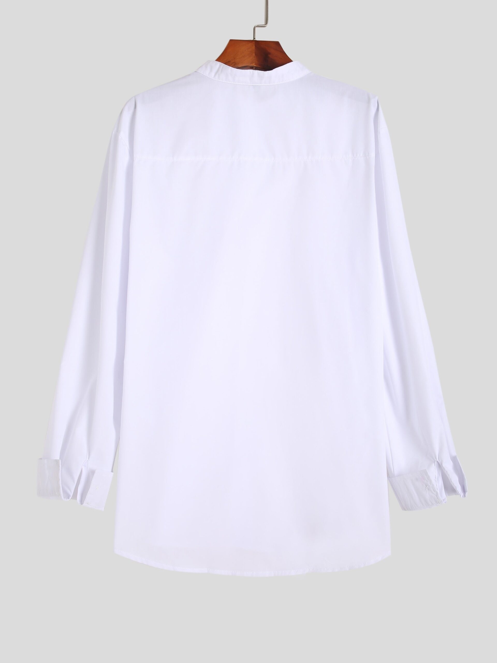 This piece of clothing is a stand-up collar white shirt. The stand-up collar design is simple and elegant, which can visually elongate the neck line, making the wearer’s neck look more slender. At the same time, it adds a sense of neatness and unique fashion sense, different from the conventional lapel shirt, and is more individualistic. The overall fit of the shirt is form-fitting, which can well show off the wearer’s body curves and highlight the upright posture of men. It is very helpful for shaping a capable and energetic image. ### Matching style